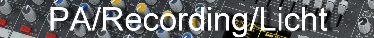PA-und Monitor-Boxen: Dynacord / Electro-Voice / HK Audio / Nova / dB Technologies / LD Systems / JBL / M-Audio / Mackie / Wharfedale / Montarbo / Endstufen: Yamaha / Nova / Dynacord / QSC / Mischpulte: Yamaha / Dynacord / Soundcraft / Mackie / Wharfedale / Allen and Heath / Mikrofone und Sendeanlagen: Beyerdynamic / AKG / Shure / Sennheiser / Peavey / MXL / LD Systems / Audio Technica / Rode / Effektgeräte: Lexicon / Yamaha / dbx / Peavey / Kabel: GPVG / Klotz / Dreitec / Schulz / Ständermaterial: König und Meyer / Endstufen